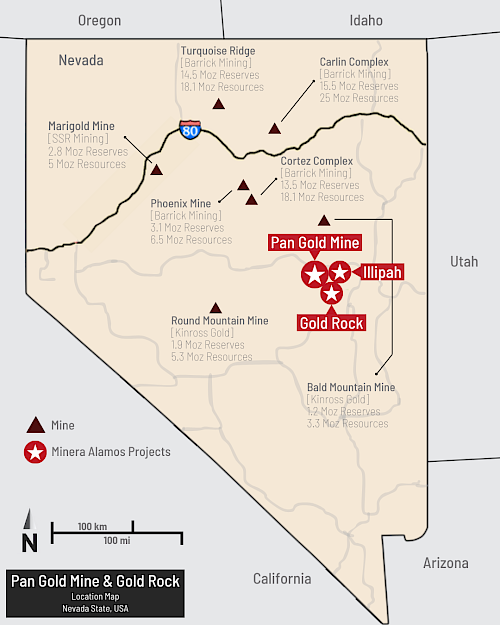 The Gold Rock Project is a federally permitted open-pit, heap leach gold project located approximately 15 km southeast of Minera’s Pan Mine on the prolific Battle Mountain–Eureka gold trend in Nevada. With grades approximately 30% higher than those at Pan, Gold Rock represents a compelling near-term growth opportunity for Minera Alamos in a proven jurisdiction.