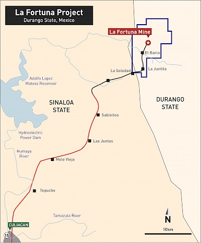 The 6,200 ha La Fortuna project is located in Durango State, Mexico. Road access is from the city of Culiacán located 85 km southwest in Sinaloa State. Paved road and grid power currently extend to within 30 km of the project with the remaining distance accessed by gravel road.